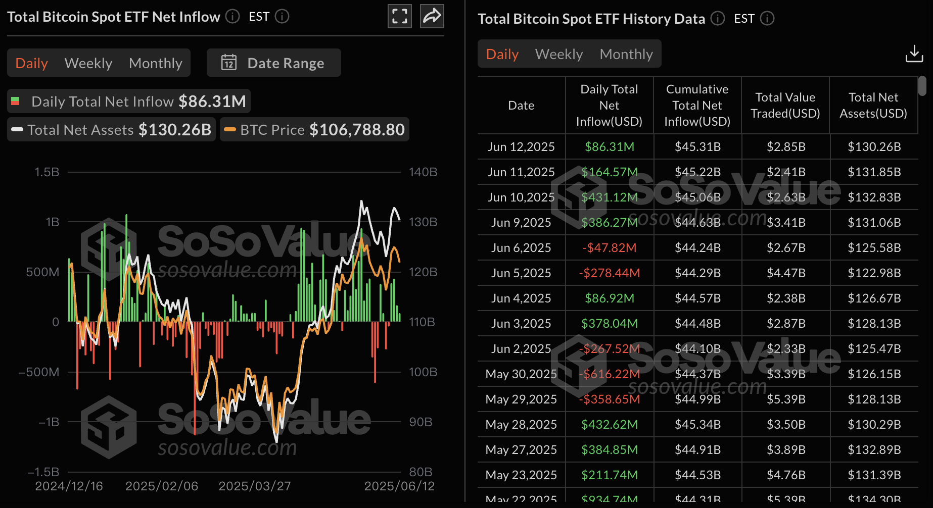 発表時点で、BitcoinスポットETFの総純資産価値は1302億5999万9999USDで、ETF純資産比率(Bitcoin市場全体の時価総額に対するETFの時価総額)は6.18%です。累積純流入は453億1000万USDに達しています。